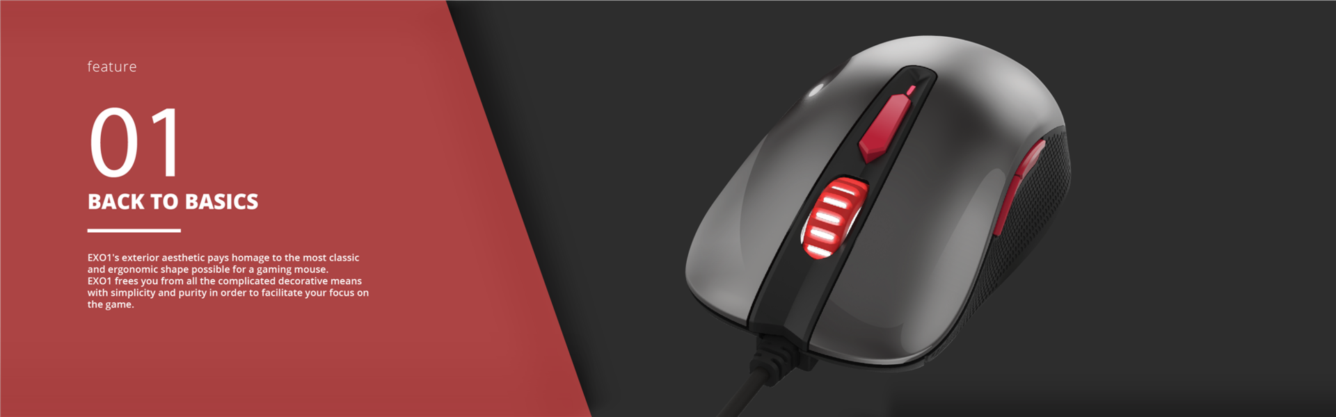 AZIO 電競 EXO1 滑鼠結合美感與人體工學,以最新真空電鍍技術和橡膠柄精心製作,提供可調式3500DPI高品質光學感測器。它重量輕、設計俐落,EXO1以滿足玩家的需求而生。